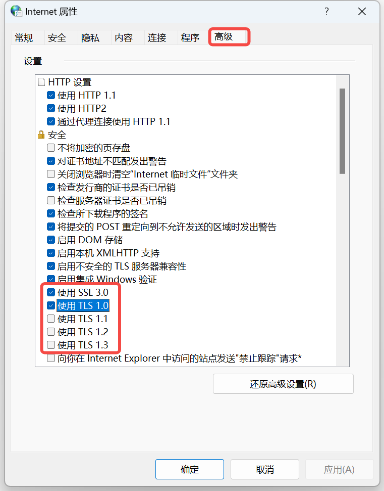 有些很烦人的软件(安全控件)特别喜欢改这个TLS设置。然后你会发现刚装好机能正常使用的应用商店和小组件突然就不能用了。如下图